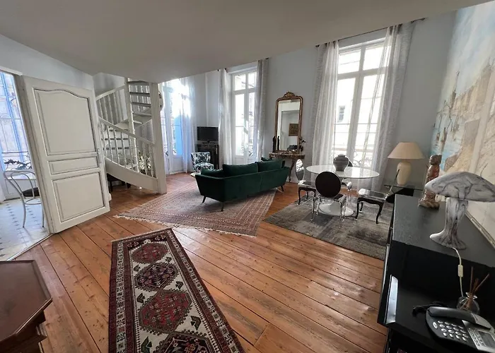 Typique Chartrons Apartment with a balcony and a seating area features modern conveniences such as a TV set to elevate your stay. The accommodation is also furnished with a sofa. Guests can make use of a bathtub, a separate toilet, and a shower. Moreover, there are a hairdryer and bath sheets as well.